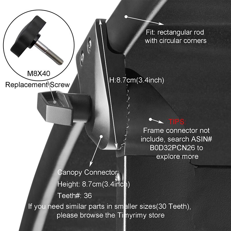 Timyrimy is not affiliated with Walmart or Mainstays Courtyard Creations. Timyrimy manufactures aftermarket replacement canopy/frame connectors for Mainstays Oversized Zero Gravity Swing, original code is SZ-8137. The plastic screw shape and material are not the same as the original.