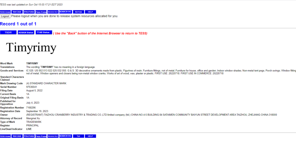 Our U.S. trademark, “TIMYRIMY,” is now officially registered with the United States Patent and Trademark Office (USPTO). This trademark represents the core of our brand and the promise of quality and reliability in every product we offer. Here are the details of our U.S. trademark registration: