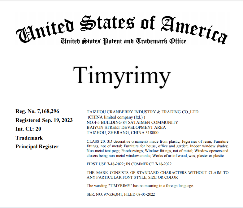 Our U.S. trademark, “TIMYRIMY,” is now officially registered with the United States Patent and Trademark Office (USPTO). This trademark represents the core of our brand and the promise of quality and reliability in every product we offer. Here are the details of our U.S. trademark registration:
